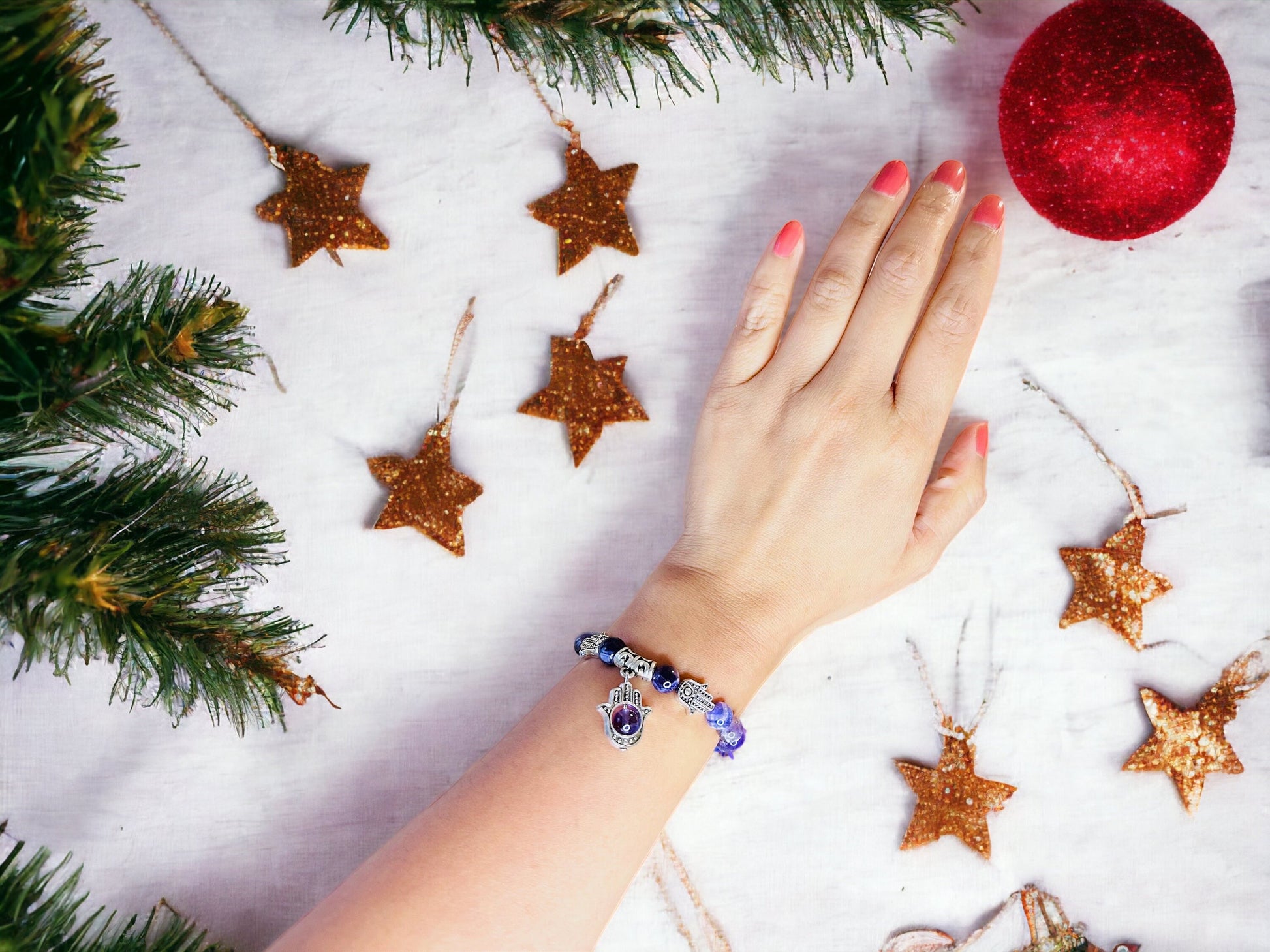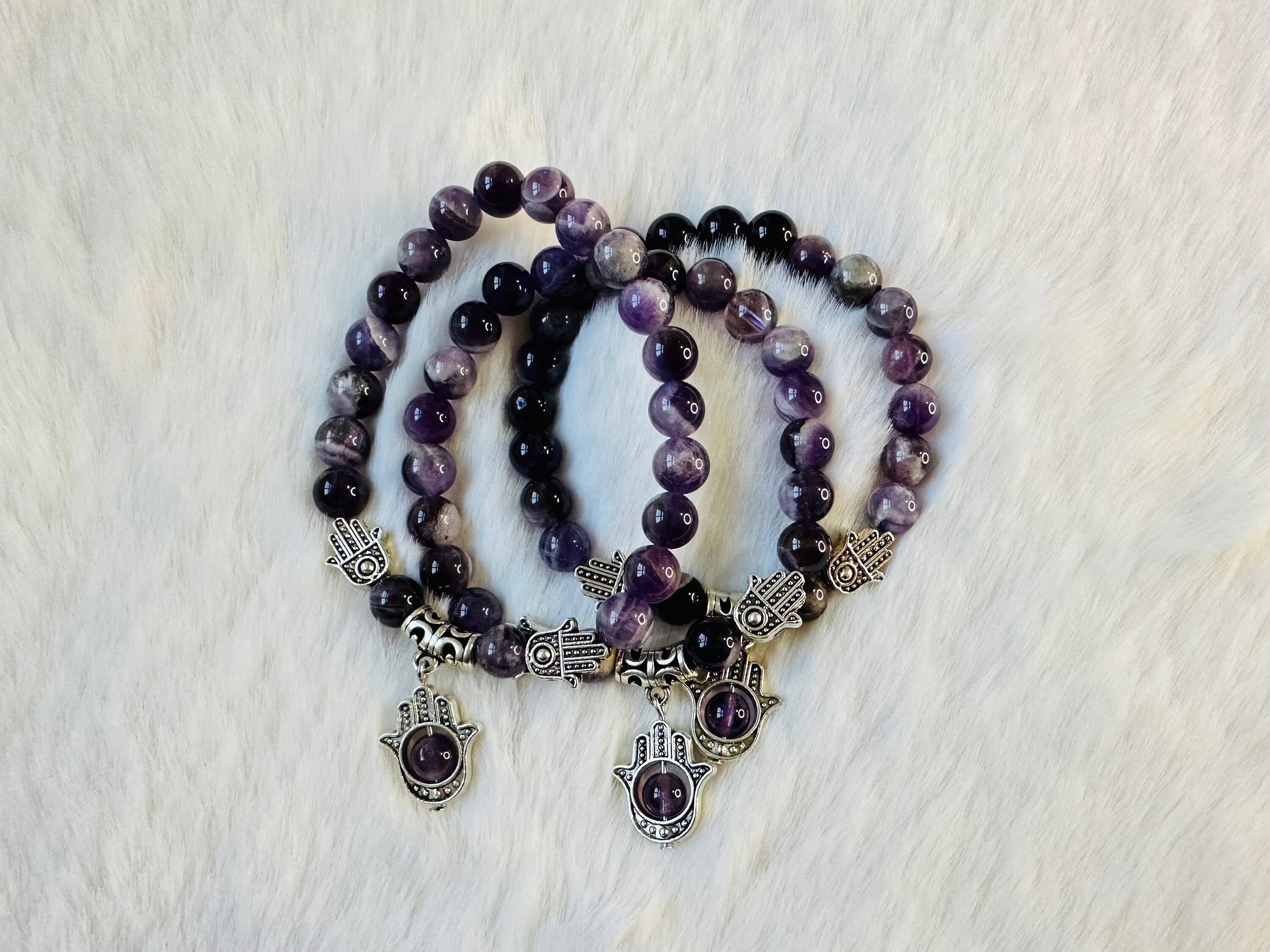 Deux perles en forme de main protectrice encadrent le bracelet, symbolisant la protection et la bienveillance. Ces mains servent de rappel constant de l'importance de prendre soin de soi et des autres.