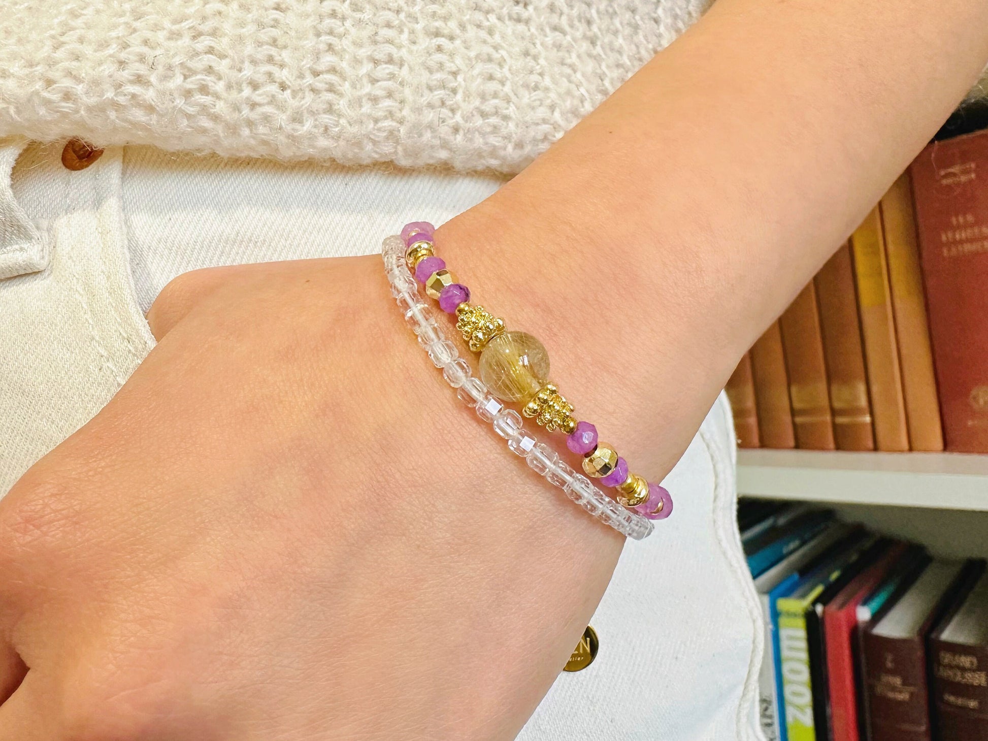 ♥ La calcédoine violette, délicate et apaisante, est associée à la paix intérieure et à la créativité. Elle éveille la spiritualité et renforce l'intuition. La perle de quartz rutile, avec ses inclusions dorées, symbolise la force intérieure et la croissance spirituelle. Elle éclaire votre chemin et vous connecte à votre sagesse intérieure.