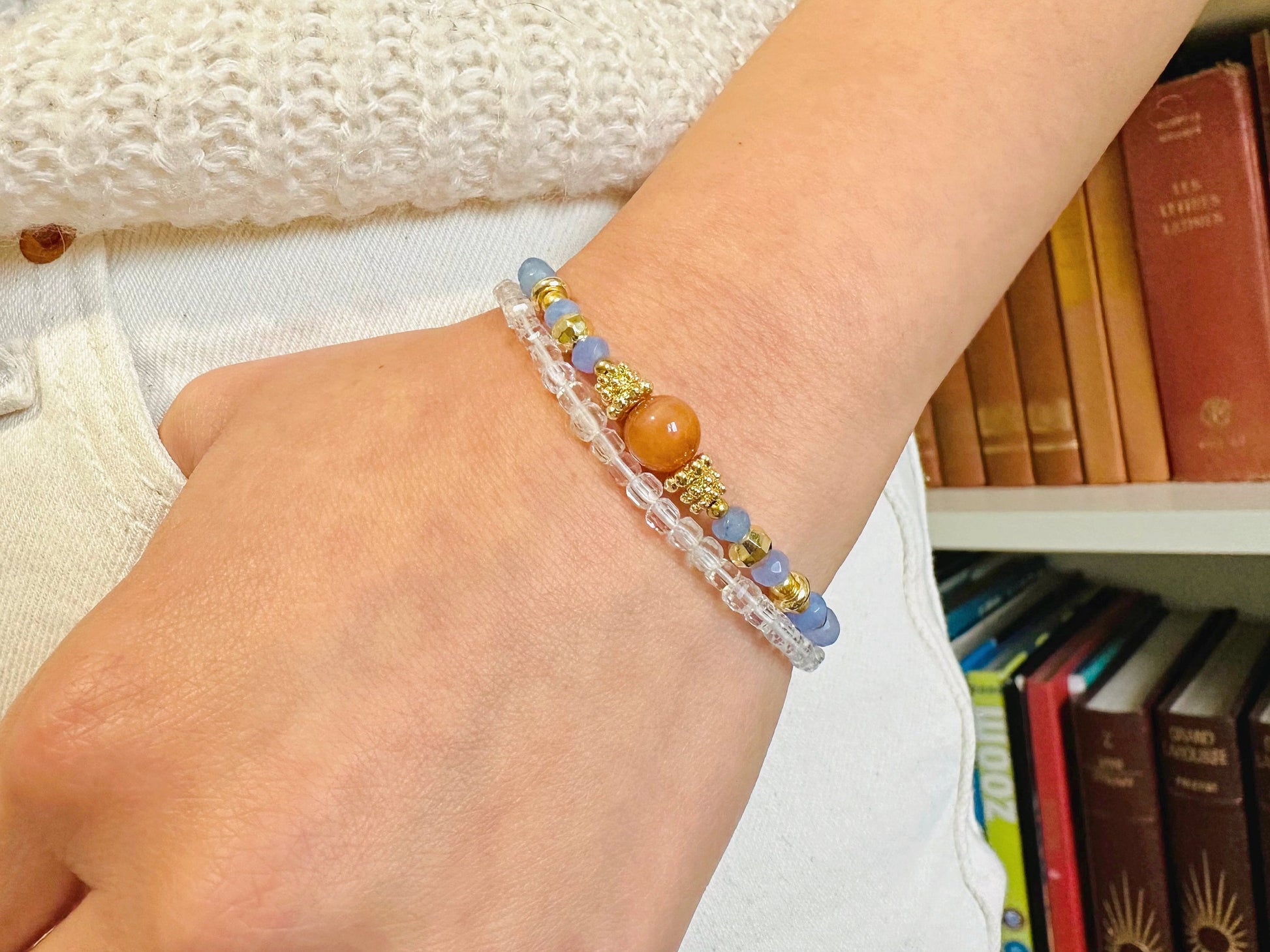 ♥ L'Agate bleue, aux reflets mystérieux, est connue pour apporter calme et équilibre. Elle favorise la paix intérieure et aide à exprimer vos vérités intérieures. La pierre de soleil, associée à l'Agate bleue, symbolise la vitalité et apporte chaleur et énergie. Elle éveille la joie et la bonne humeur, éclairant votre journée.