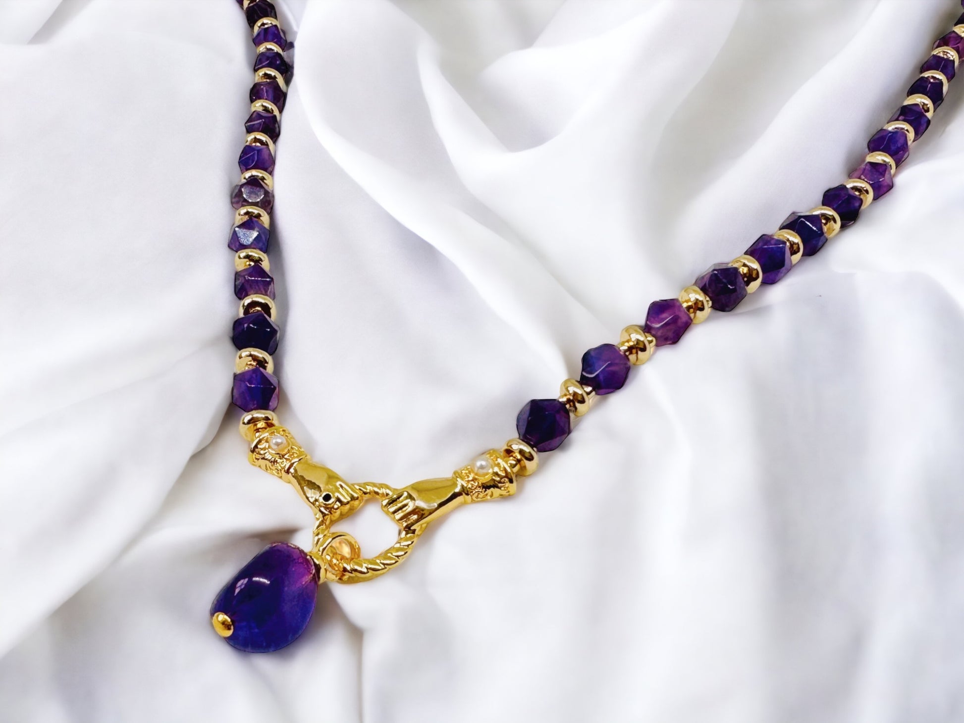 Ce collier est composé de perles d'améthyste facettées avec un pendentif en perle d'améthyste baroque. Chaque perle d'améthyste est soigneusement sélectionnée pour sa beauté et sa qualité exceptionnelles.