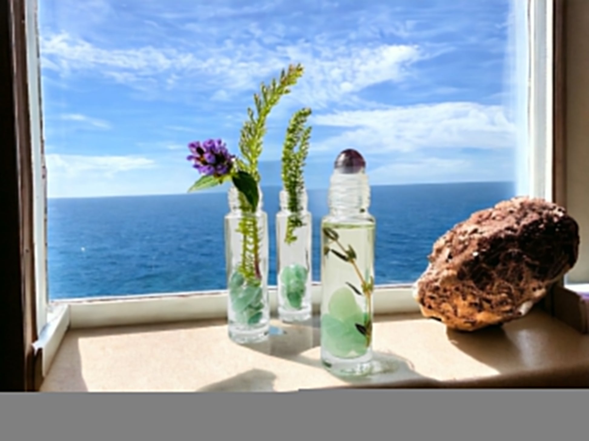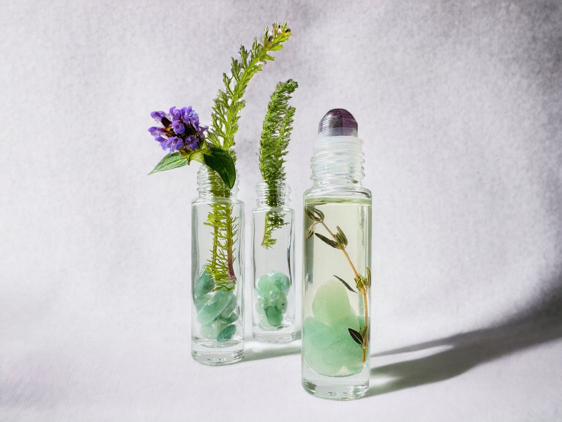 Chaque tube de 10ml en bouteille verre comprend une feuille de thym et des petits pierres de jade, avec un embout d’améthyste. Jade est une pierre de santé avec l'énergie pour apaiser l’esprit. Et l’améthyste est réputée pour sa grande capacité à canaliser et équilibrer les dérèglements d’origine nerveuse.
